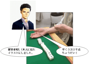 半荘も終わりに近い局で親のN氏が親満のリーチをかけました。下家のS氏がすぐに追っかけリーチをしました。(一般的に追っかけリーチをする人には素直な人は少なく意地悪な人が多いと言われています。)数巡目にN氏の捨て牌にS氏はいやらしい声で“高目”と言って上がりました。跳満でした。N氏の持ち点は400点になってしまいました。