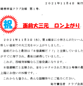 ★2017年8月にS氏が役満(大三元)を上がりました。